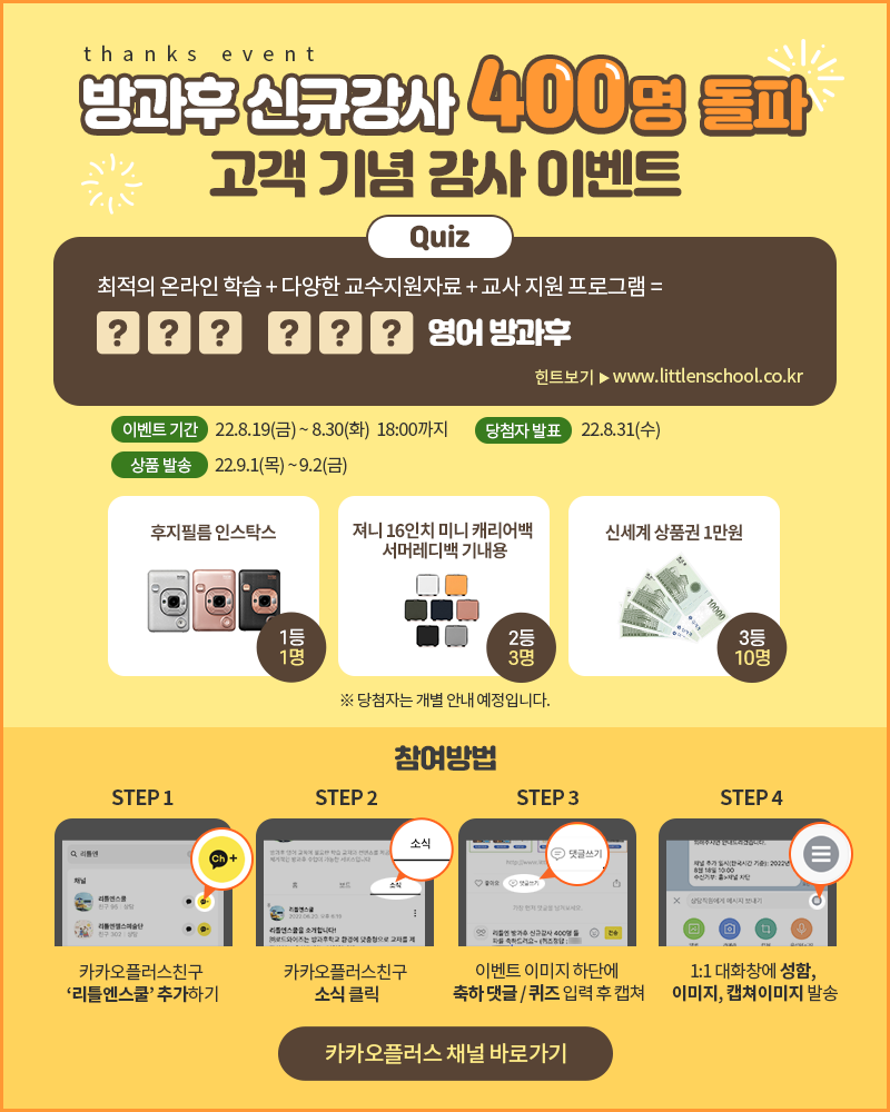- 리틀엔스쿨 <방과후 신규 강사 400명 돌파> 감사 이벤트 안내